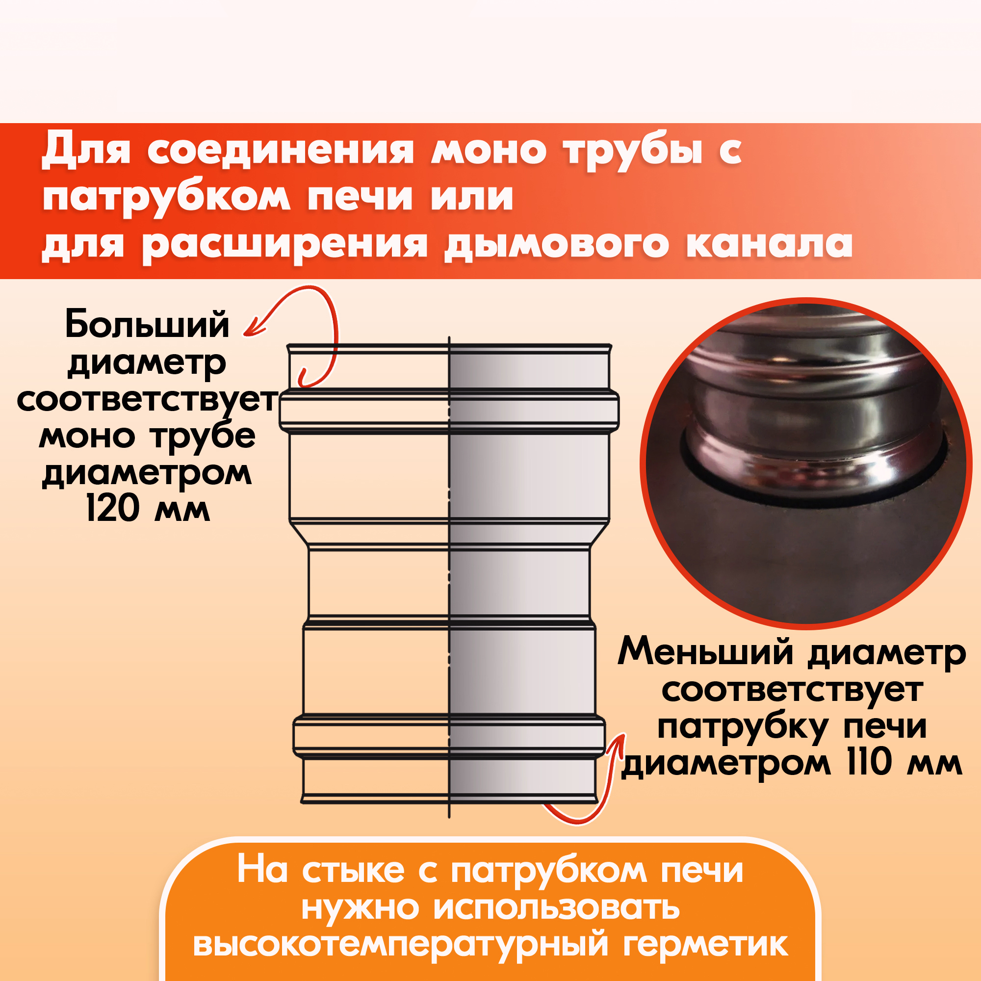 ВНИМАНИЕ: Меньший диаметр адаптера всегда должен быть снизу, так как дымоходный канал может только расширяться.