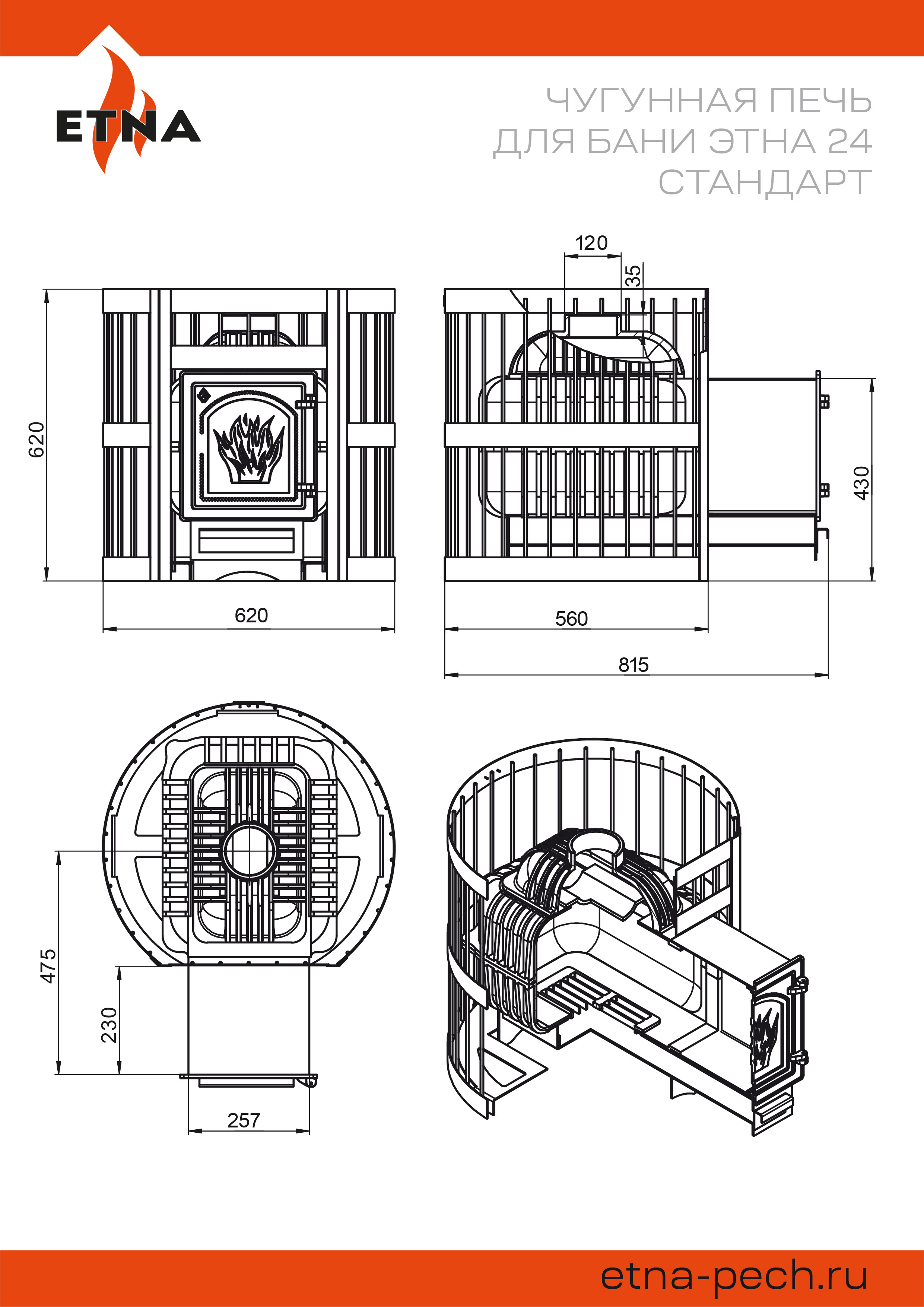 Банная печь ЭТНА 24 ДТ-4С изготовлена из чугуна высокого качества. Материал с высокой теплопроводностью, чугун быстро передаёт энергию сжигаемого топлива наружу, в пространство парной. Толщина деталей корпуса составляет 6-8 миллиметров.