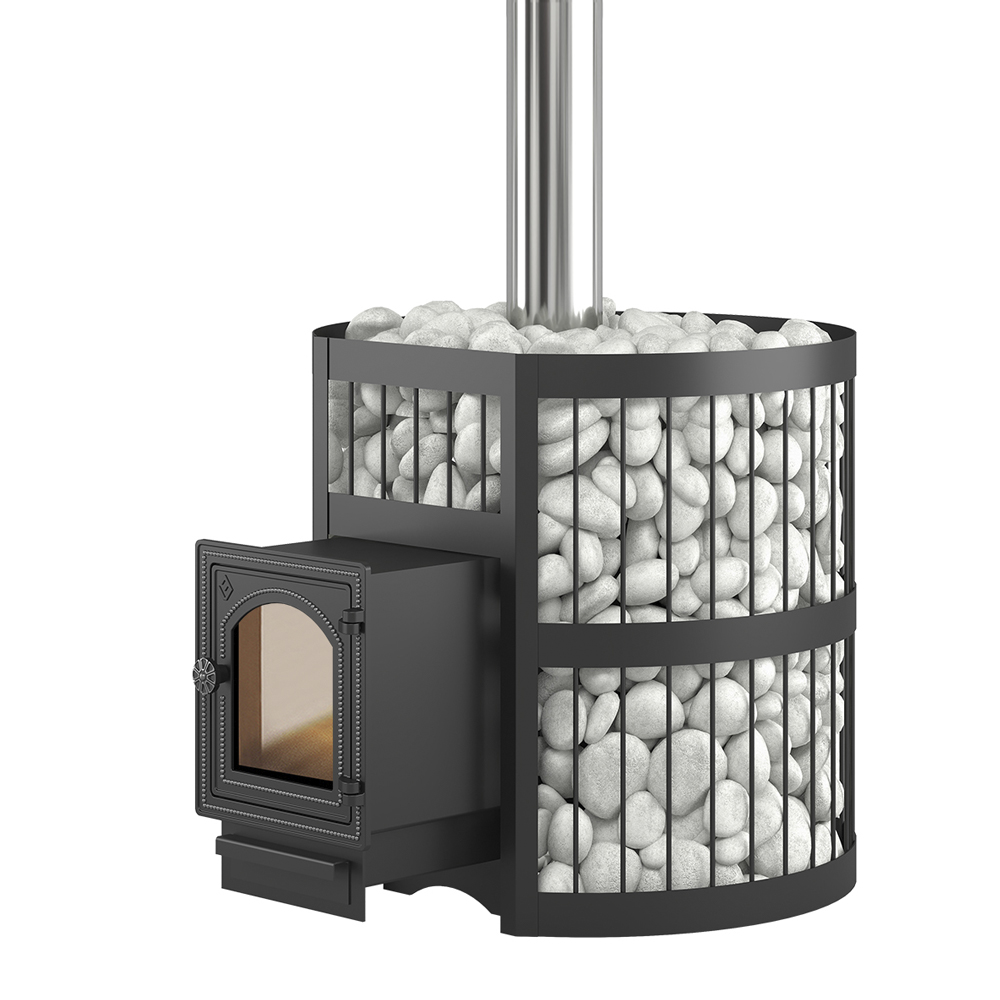 Для устройства наружной открытой каменки печь ЭТНА 24 оснащается металлическим кожухом с прорезным рисунком оригинального дизайна. Пространство между печью и кожухом из двухмиллиметровой стали заполняется камнями для бани, которые выполняют роль теплонакопителя, перераспределяют тепло от стенок топки и защищают парящихся от жёсткого инфракрасного излучения. Воду подают на нагретые камни, с которых полученный пар распространяется по всему объёму парной. Кожух диаметром 560 миллиметров вмещает в себя до 110 килограммов камней крупной и средней фракции.