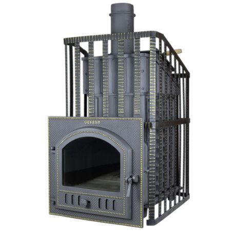 Гефест ЗК 45 Ураган (П) - расширенный комплект печи Гефест ЗК в сетке. Максимально приближенный вариант печи для режимов русской парной, имеющий непосредственно закрытую чугунным коробом каменку, дверцу для пара с ручкой из бука, увеличенную до 50см чугунную стартовую трубу. Печь легко модернизируется до полноценной печи предназначенной для Русской бани путем замены стальной сетки на каменную облицовку без демонтажа дымохода.
