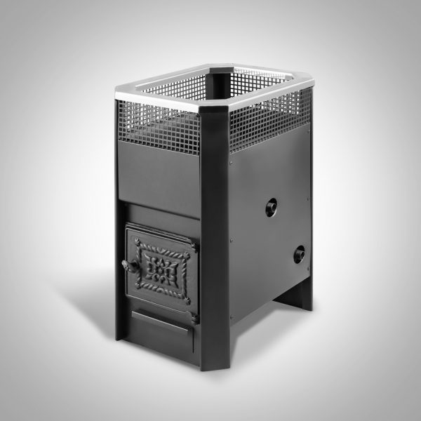 Печь для бань и парных небольших размеров. Может комплектоваться съемным выносным каналом, легко монтируемым к печи. Вместительная каменка открытого типа благодаря решетке кожуха обеспечивает равномерный рассеянный пар. Встроенный теплообменник, соединенный с выносным баком, образует систему для нагрева воды. При изготовлении печи выводы теплообменника могут располагаться слева, справа или сзади. Высокая термодинамика достигается уникальной конструкцией дымохода, регулировкой подачи воздуха, способствующей более эффективному сгоранию и снижению расхода дров. Съемный кожух-конвектор обеспечивает отвод тепла от печи и циркуляцию воздуха в помещении. Для чистки печи на некоторых моделях предусмотрены прочистные дверки.