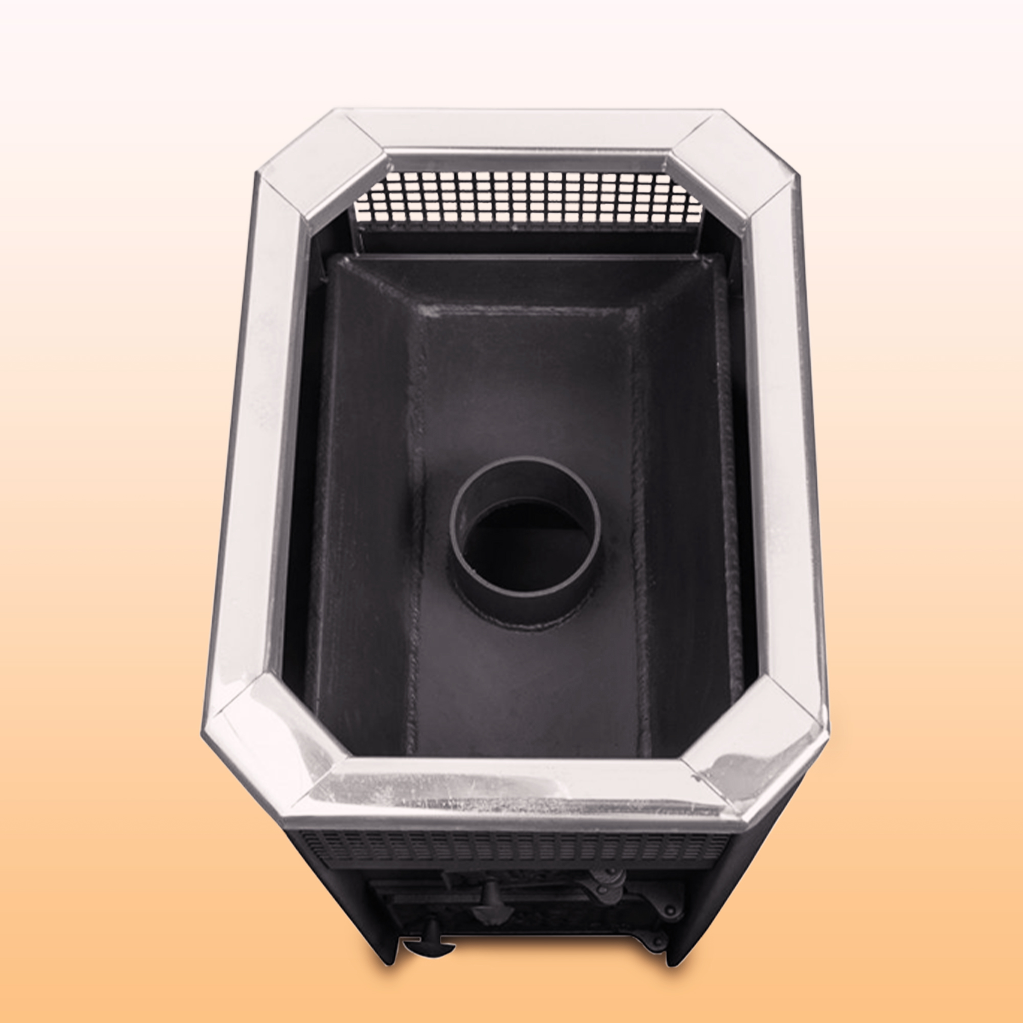 Печь устанавливается непосредственно в парной, для этого нужно собрать только дымоходную систему и заложить камни, и ваша печь для бани готова.