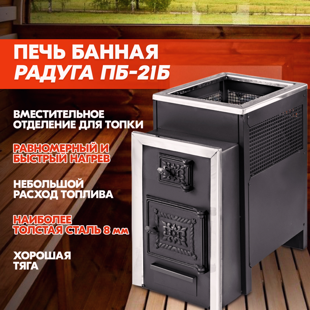 Печь банная Радуга ПБ-21Б дровяная имеет удобную конструкцию и вместительное отделение для топки, обеспечивает быстрый и равномерный нагрев бани.