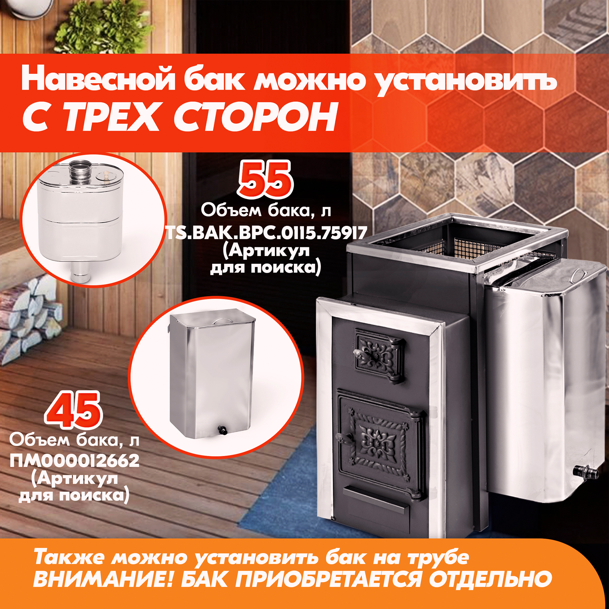 Съемный навесной бак закрепляется непосредственно на печи, что исключает необходимость приобретения соединительных трубопроводов и их монтаж.