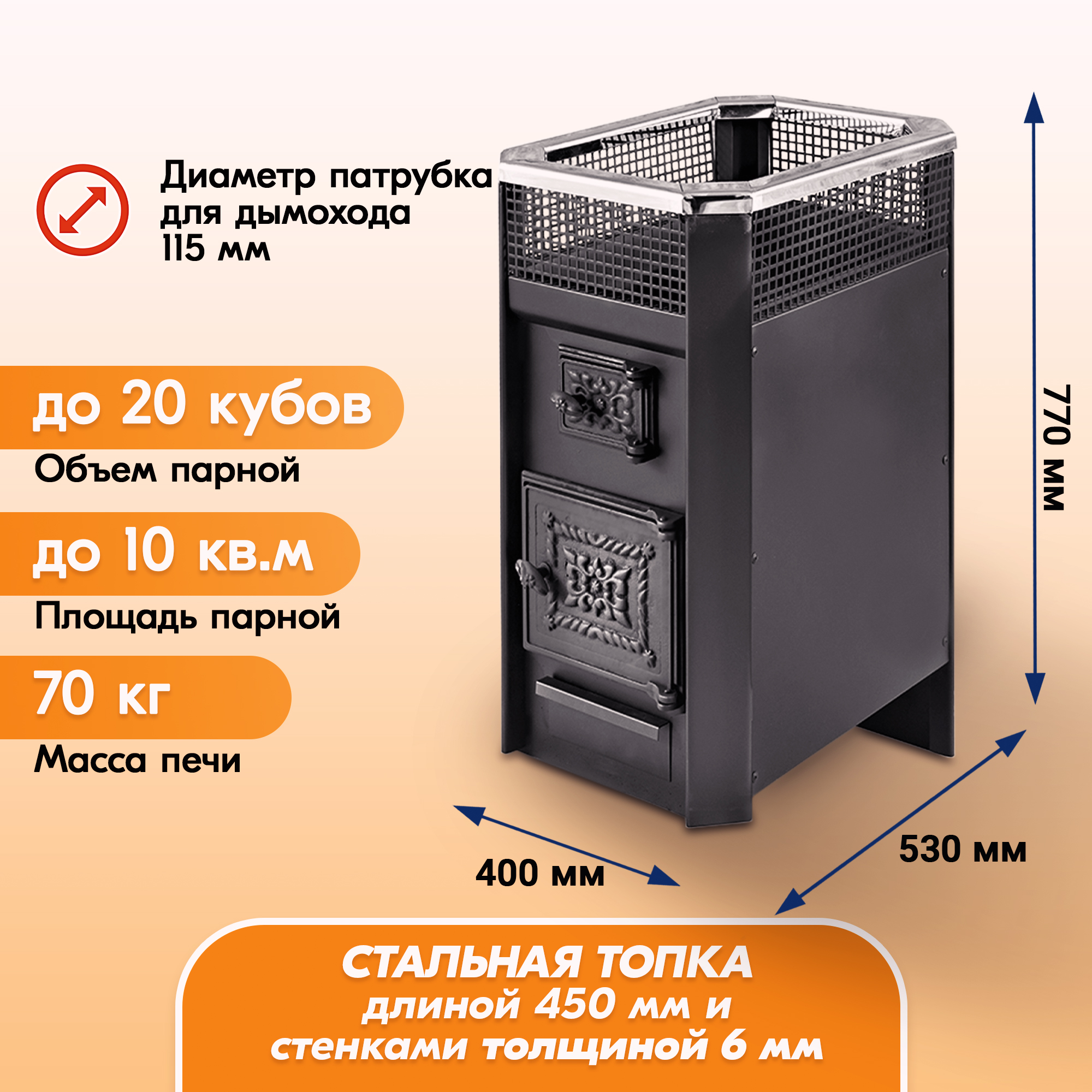подходит для организации бани небольших размеров. Небольшой вес, прочный корпус дают возможность эффективно эксплуатировать топку