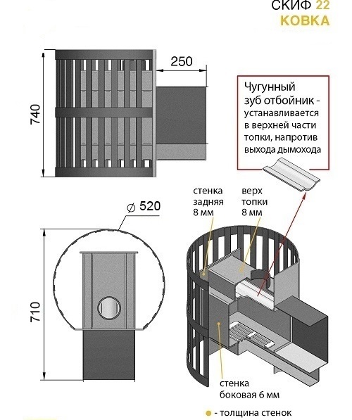 Банная печь Скиф ВК укомплектована чугунной герметичной, самоохлаждаемой дверцей с жаропрочным стеклом, с оборудованной системой самоочистки, и имеет кованный конвекционно-вентилируемый кожух (сетка). Дровяная печь Везувий Скиф 22 ВК рассчитана на объем парильного помещения 12-22 м3. В конструкции данной печи предусмотрен топочный тоннель длиной 250 мм, при помощи которого печь топится из соседнего помещения, смежного с парильным Банная печь Скиф 22 ВК (К) относится к так называемым печам – сеткам. По всей поверхности теплообменника в сетку закладываются камни, которые образуют своеобразный каменный конвектор, защищающий от слишком интенсивного инфракрасного излучения нагретых частей печи и одновременно, благодаря возникающей конвекции через зазоры между камнями, очень эффективно обогревающий парную. Большая масса камней накапливает тепло и создает мягкое и комфортное излучение, как будто печь сложена из кирпича.