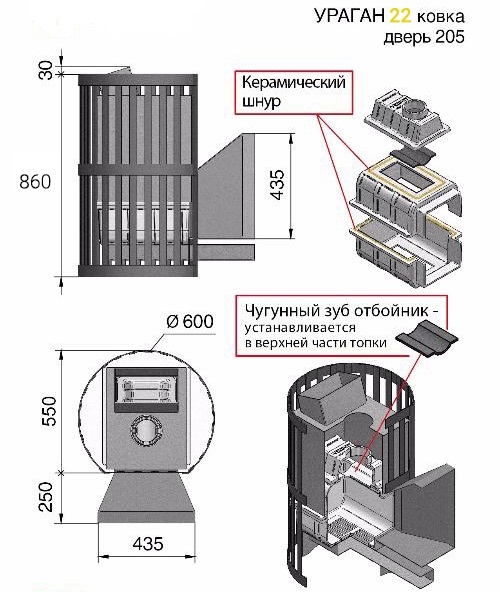 Преимущество печи в том, что она состоит из 3-х элементов. На стыке между ними используется керамический шнур с рабочей температурой 1200 градусов. То есть топка печи абсолютно герметична! Для фиксации деталей между собой применяется болтовое соединение, что даёт 100% гарантию безопасности при эксплуатации.