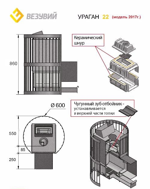 Уникальность чугунной банной печи «Ураган» заключается в установке в верхней части печи Легенда закрытой каменки, камни в ней нагреваются до 400°С, что позволяет достичь мелкий дисперсионный пар.