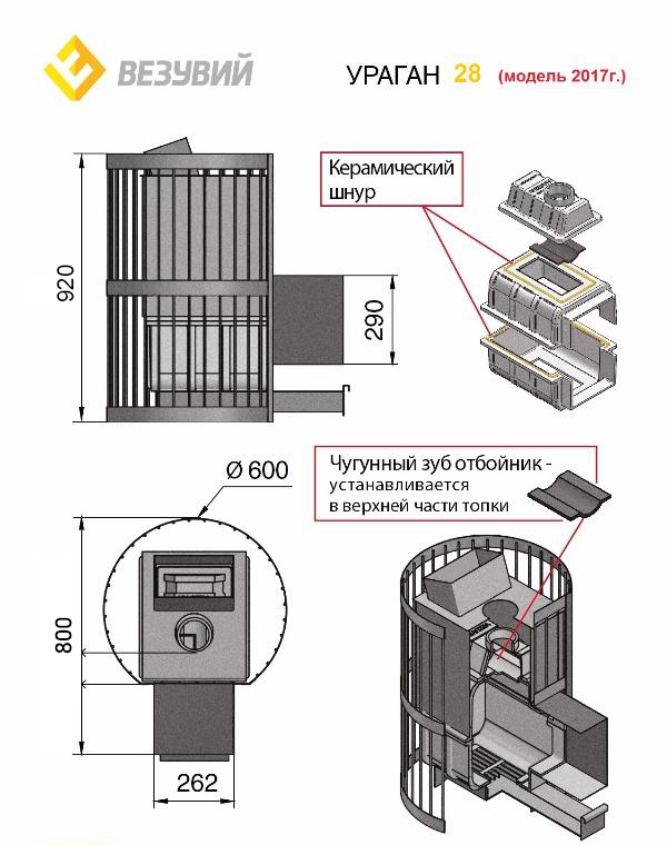 Для любителей бани погорячей - компания Везувий изготовила банную печь Ураган с закрытой каменкой. Топка печи изготовлена из жаропрочного чугуна 12 мм и способна выдерживать высокие температуры, тем самым камни, находящиеся в закрытой каменки нагреваются до очень высоких температур, что позволяет в процессе парения достичь «мягкий» пар . В топочной дверце присутствует стекло и есть возможность наблюдения за огнём. Также оборудование имеет одно из лучших соотношений цены к качеству в своей серии. Кроме того, печь-каменка имеет выносной топочный тоннель и может загружаться дровами из предбанника, что экономит место в парильном помещении. «Ураган Ковка 28 (270)» может работать в 2 режимах – скоростном и длительном. В первом одной порции дров достаточно для работы на протяжении 1–2 часов, в течение которых всё помещение парилки полностью нагревается до нужной температуры и заполняется паром. В длительном (экономичном) режиме одной загрузки поленьев хватает для работы оборудования на протяжении 2–3 часов. Равномерность распространения горячего воздуха печью обеспечивается 280 кг камней в двух её каменках (80 кг в закрытой, 200 кг – в закрытой).