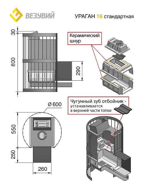 Банная чугунная печь Ураган Стандарт 16 (ДТ-4С) укомплектована чугунной не герметичной дверцей Везувий ДТ-4С с жаропрочным стеклом «SHOT ROBAX». Закрытая каменка изготовлена из стали и вмещает в себя не менее 60кг камней Конвекционно-вентилируемый кожух "Стандарт" изготовлен из металлического прутка диаметром 6мм покрашенной черной термостойкой краской.