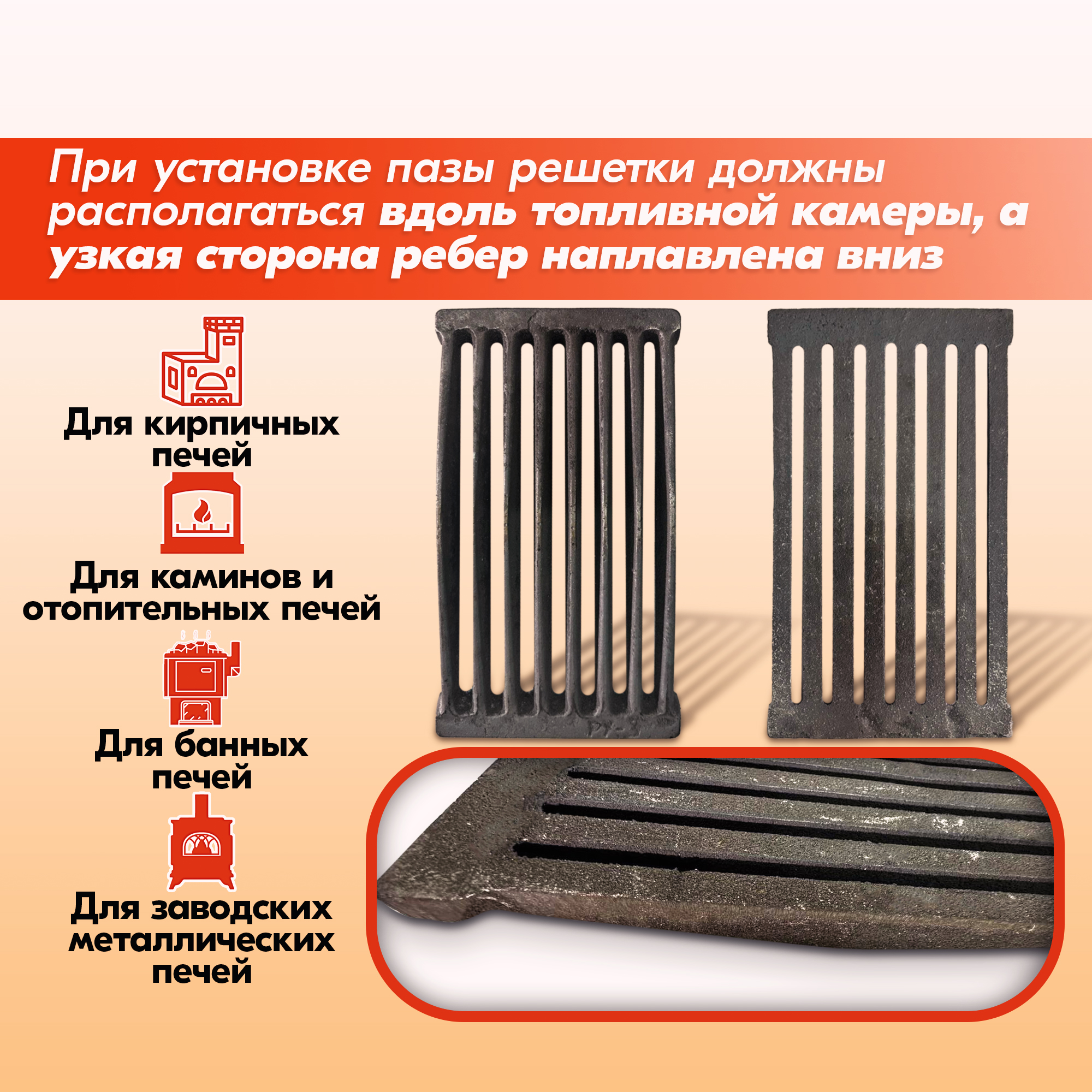 Колосник нужно устанавливать узкой стороной рёбер вниз, в противном случае срок его службы значительно снижается.